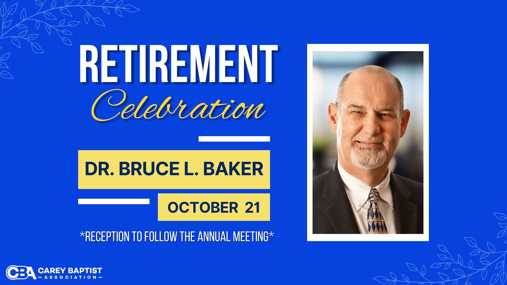 Following the meeting, we will take time to honor Dr. Bruce Baker, our Director of Missions, as he is retiring at the end of this year. We look forward to celebrating his many years of faithful leadership and service to our Association and hope that you will join us for that celebration.